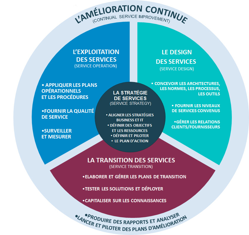 ITIL® place le concept de service au cœur des bonnes pratiques afin de fournir de la valeur d’usage de bout en bout. Le fournisseur de services opère et optimise un catalogue de services (messagerie, visioconférence, stockage, etc.) afin de délivrer de la valeur aux Métiers, dans une relation client/fournisseur. Les Directions Métiers sous-traitent au fournisseur de services la création et la maintenance des outils qui lui sont nécessaires pour assurer sa mission. Le fournisseur prend en charge les risques opérationnels et facturent ces services tandis que le client se concentre sur son cœur de métier.