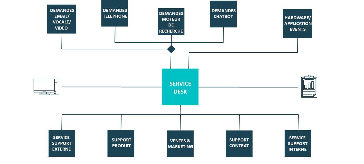 - Le service desk gère les appels de bout en bout, avec escalade au niveau 1/2/3 et externe.