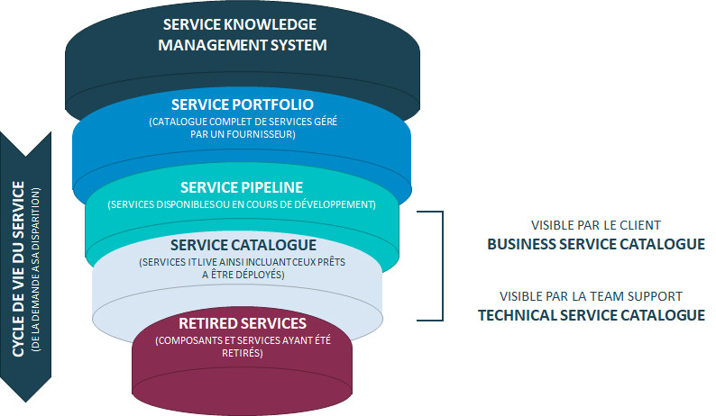 La gestion du portefeuille de services est appuyée par un « Service Knowledge Management System » qui synthétise une vue en temps réel du portefeuille de services, des projets en cours et du (ou des) catalogue(s) de services.